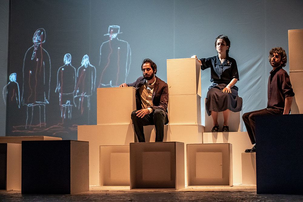In una scena completamente bianca, composta di elementi geometrici, tre figure si muovono in una dimensione astratta, assolutamente decontestualizzata, in cui il riverbero della luce contrasta l’orrore evocato da quei truci accadimenti. È il non luogo dell’innocenza spezzata, quella delle decine di bambini, anche neonati e dei ragazzi, è il non luogo degli amori mai consumati, dei domani che non giungeranno per nessuno, né per le vittime, né per i sopravvissuti.”